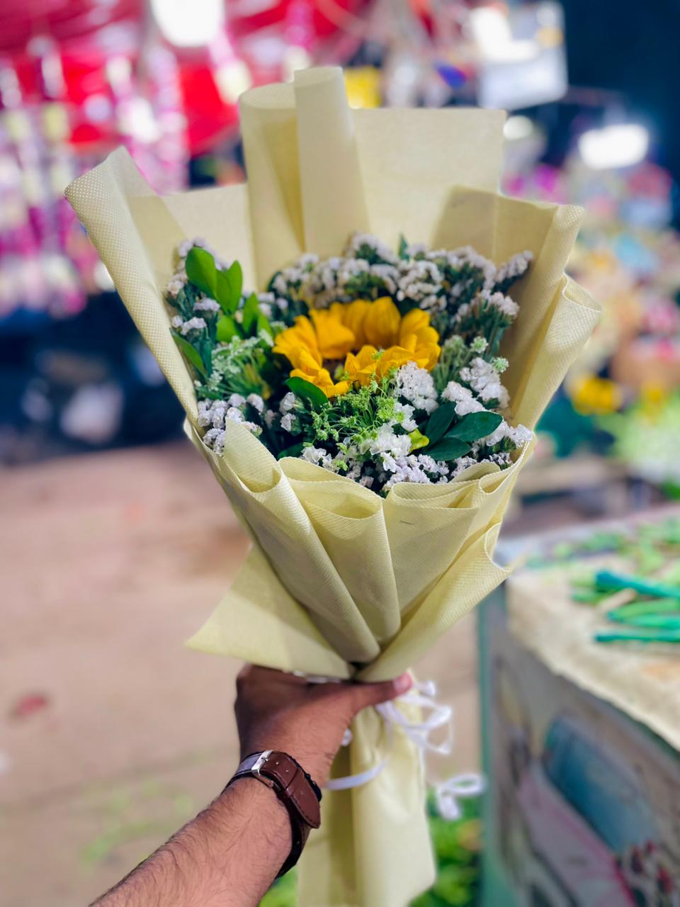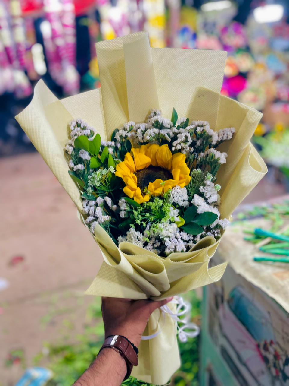 1 sunflower bouquet with imported statice in off white wrapping sheet
