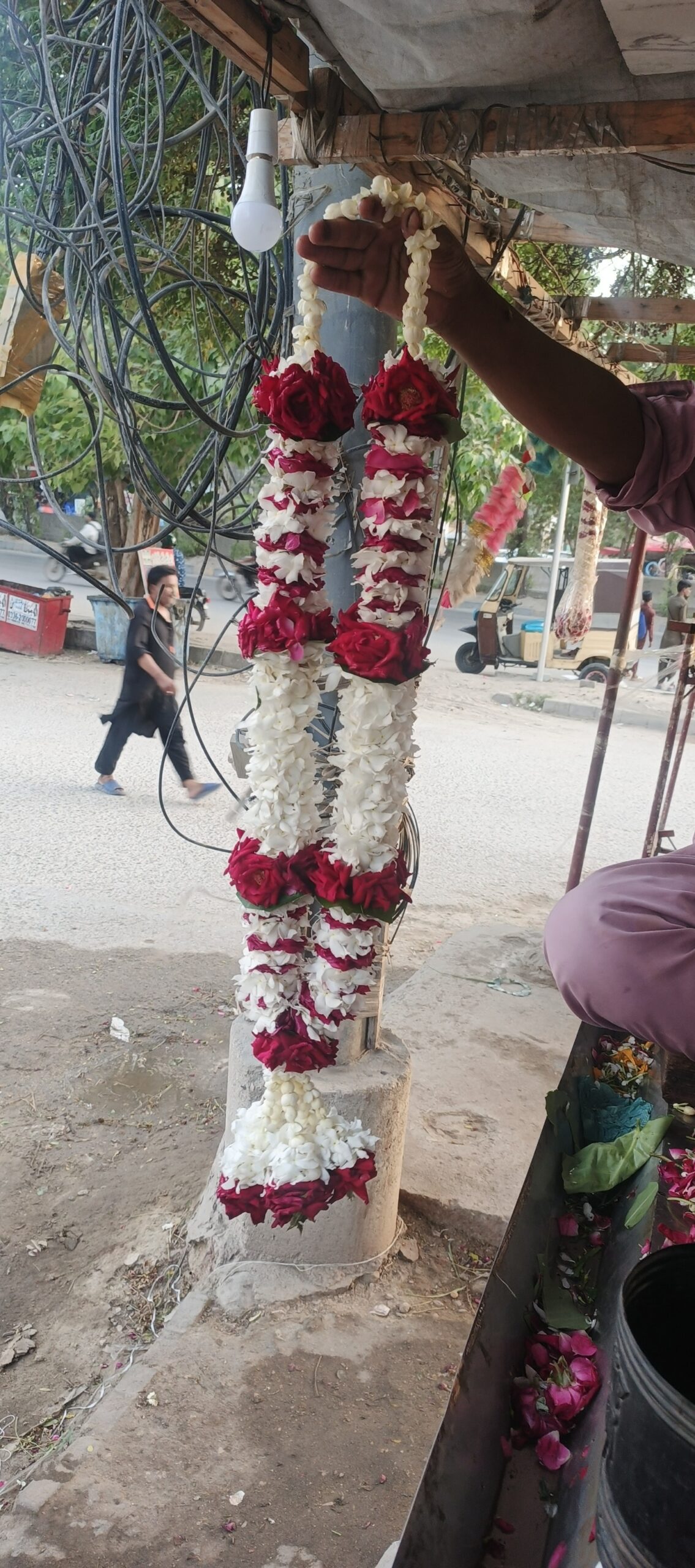 Our Artisanal Red Rose Petal & Jasmine “Motiya” Layered Imperial Haar represents the pinnacle of traditional floral craftsmanship. Moving beyond simple whole-flower stringing, this Haar utilizes a specialized “petal-stacking” technique where hundreds of individual, fresh red rose petals are meticulously layered to create a dense, velvety texture that is soft to the touch and visually striking.