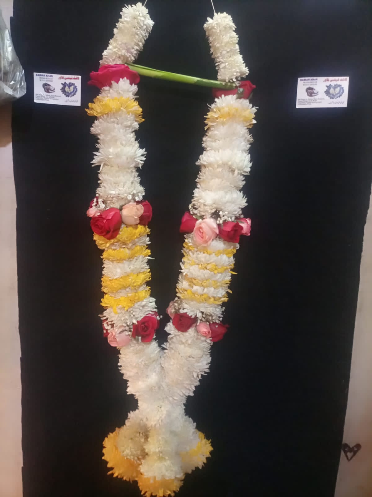 Our Artisanal Yellow-Trimmed White Chrysanthemum & Mixed Rose Haar is a masterclass in balanced color theory and floral texture. The design is built upon a high-density foundation of pure white chrysanthemums, meticulously hand-strung to create a soft, ruffled “pillar” silhouette. This pristine base is artfully interrupted by vibrant yellow-tipped chrysanthemum tiers, adding a sunny, festive glow that enhances the Haar’s visual depth.