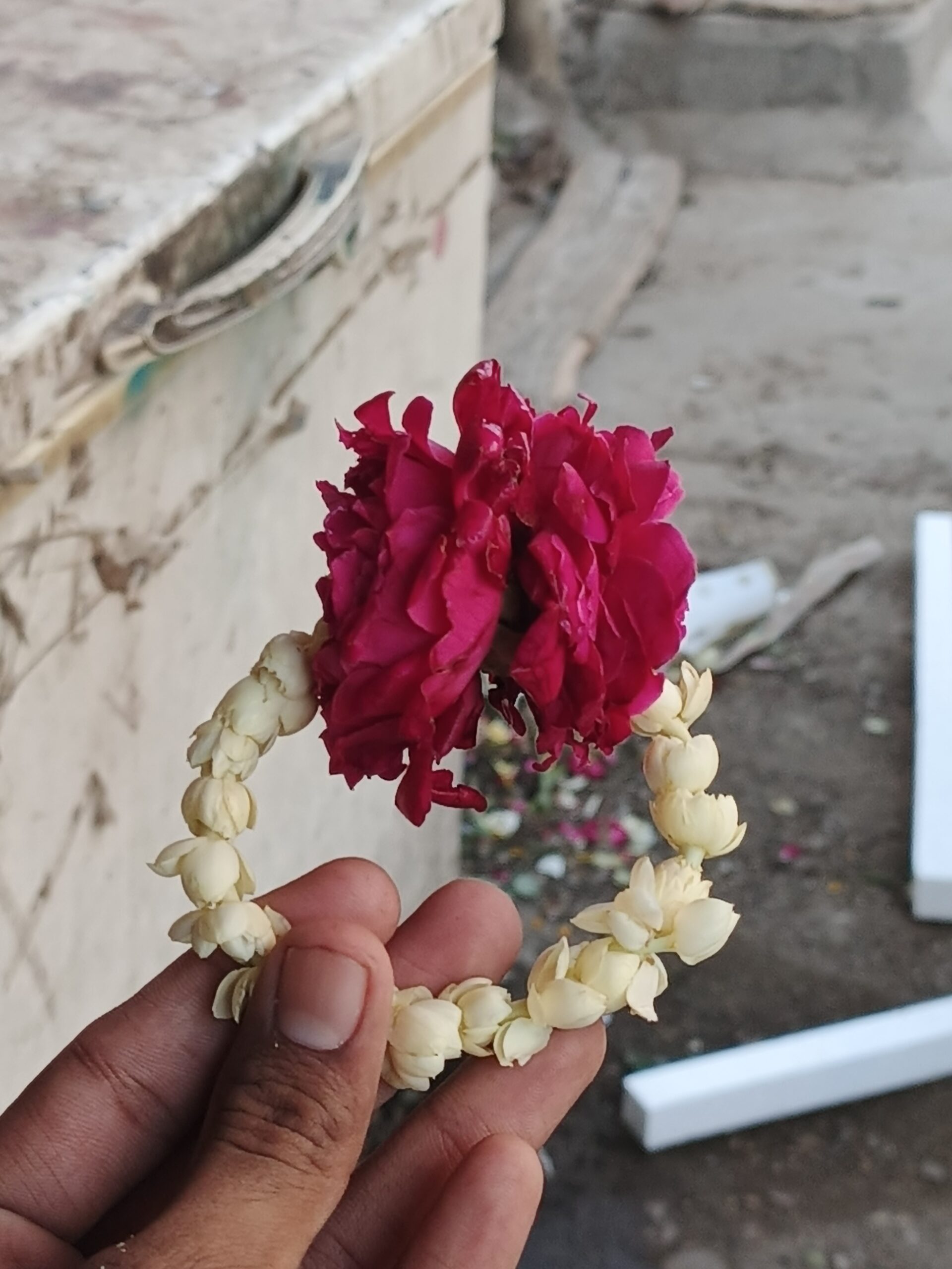 The focal point is a deep crimson rose, selected for its rich color and velvety petals, symbolizing love and celebration. This striking center is perfectly framed by a meticulously hand-strung ring of fresh white jasmine buds (Motiya). These buds are chosen at the peak of their fragrance, ensuring that the Gajra provides a natural, refreshing perfume throughout your event. Small and lightweight, this Gajra is designed to be worn comfortably on the wrist or as a hair accessory, making it a versatile choice for Mehendi ceremonies, Mayoon functions, or festive gatherings.
