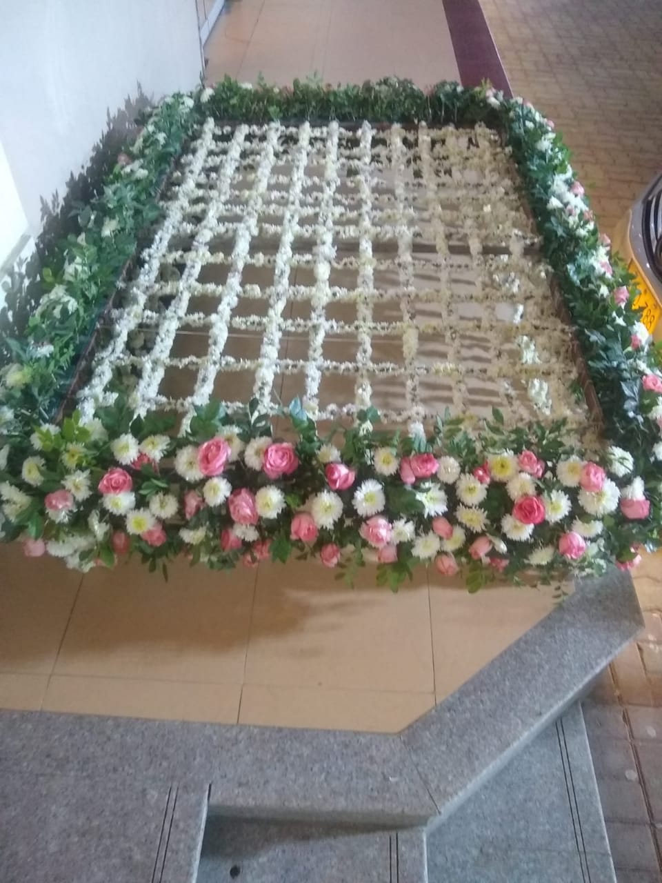 The airy center is perfectly balanced by a high-volume, tiered border. This perimeter is artfully composed of blush pink roses, pure white chrysanthemums, and sprays of fresh Gypsophila. The lush greenery at the base provides a natural garden feel, while the rose-heavy front ensures a stunning frame for “first look” photography. Built on a sturdy yet lightweight frame with four reinforced handles, this Chadar is as functional as it is beautiful.