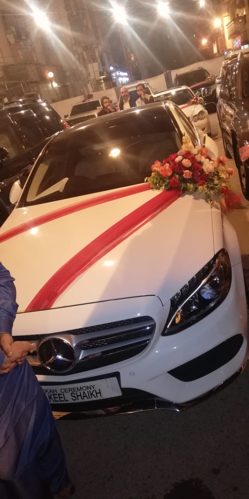 Elevate your wedding procession with the minimalist elegance of our Fresh Red and Peach Rose Bouquet with Dual Crimson Silk Draping. Designed specifically for modern luxury sedans like the Mercedes-Benz C-Class, this arrangement swaps traditional full-hood coverage for a refined, asymmetrical look that emphasizes the vehicle’s prestigious lines.