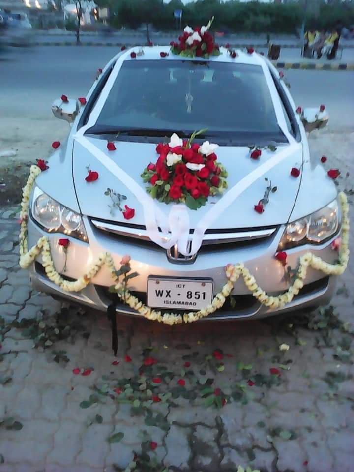 The highlight of this arrangement is the scented jasmine (Motiya) garlands that drape elegantly along the front bumper and side panels. Each garland is hand-woven to provide a continuous, fragrant trail of white blossoms. This is beautifully complemented by a lush central bouquet of premium red and white roses situated on the hood, anchored by broad white silk ribbons that extend toward the grille. Individual red roses are delicately scattered across the hood and roof to create a cohesive, garden-like flow throughout the vehicle.