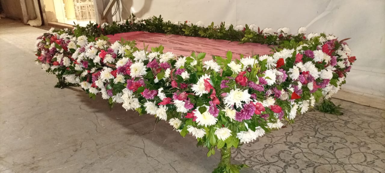 The arrangement is built on a heavy-duty volume of pure white chrysanthemums, providing a plush, ruffled foundation. It is artfully accented with deep purple asters and vibrant red roses to create a sophisticated, multi-tonal palette. Supported by four ornate gold-finished pillars, this canopy provides a garden-fresh frame that looks magnificent in photography. The dense greenery woven throughout adds a natural, forest-like depth, making it a perfect choice for grand Barat or Valima entries.