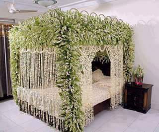 The dense floral walls are complemented by a 360-degree veil of hand-strung jasmine buds. These garlands hang from every side of the canopy, creating a shimmering, translucent screen of white flowers that provides an unparalleled sense of privacy and luxury. The sheer volume of fresh blooms ensures the room is filled with a deep, intoxicating fragrance that lasts throughout the night. This is more than just decor; it is a once-in-a-lifetime sensory masterpiece.