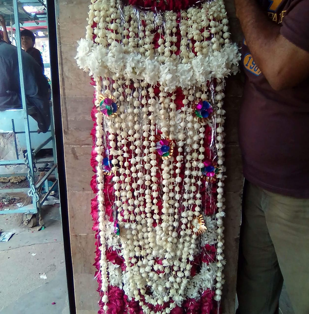 The white jasmine (Motiya) base is artfully contrasted with layers of vibrant crimson rose petals and interspersed with metallic silver tinsel to catch the light during evening ceremonies. To add a touch of modern flair, the strands are embellished with small, multi-colored Gota-work rosettes, ensuring the Sehra remains a focal point of the groom’s ensemble. Lightweight and breathable, it is designed to be securely fastened to any traditional turban without causing discomfort.