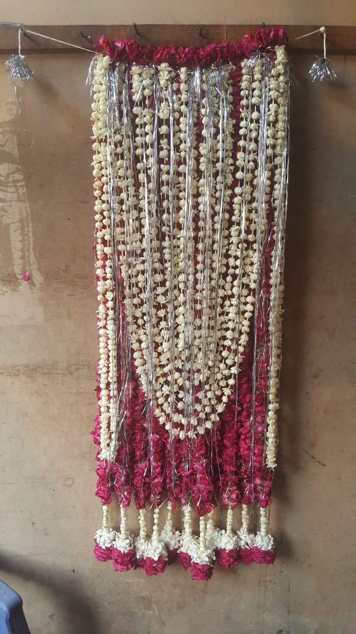Our Imperial Jasmine “Lahar” Sehra is a masterpiece of floral symmetry, designed to provide the groom with a royal and traditional silhouette. This Sehra features a unique “double-layer” effect: the background is a solid wall of deep crimson rose petals, while the foreground consists of hand-strung white jasmine garlands arranged in rhythmic, cascading waves.