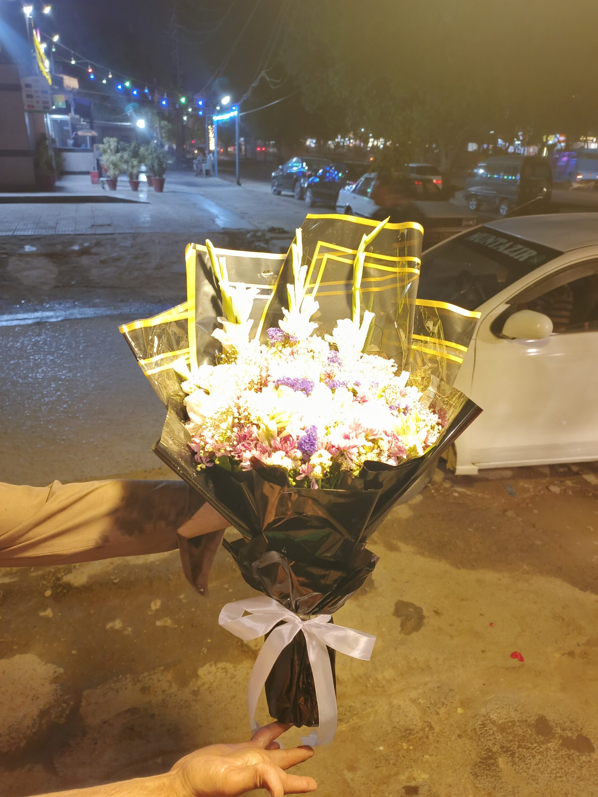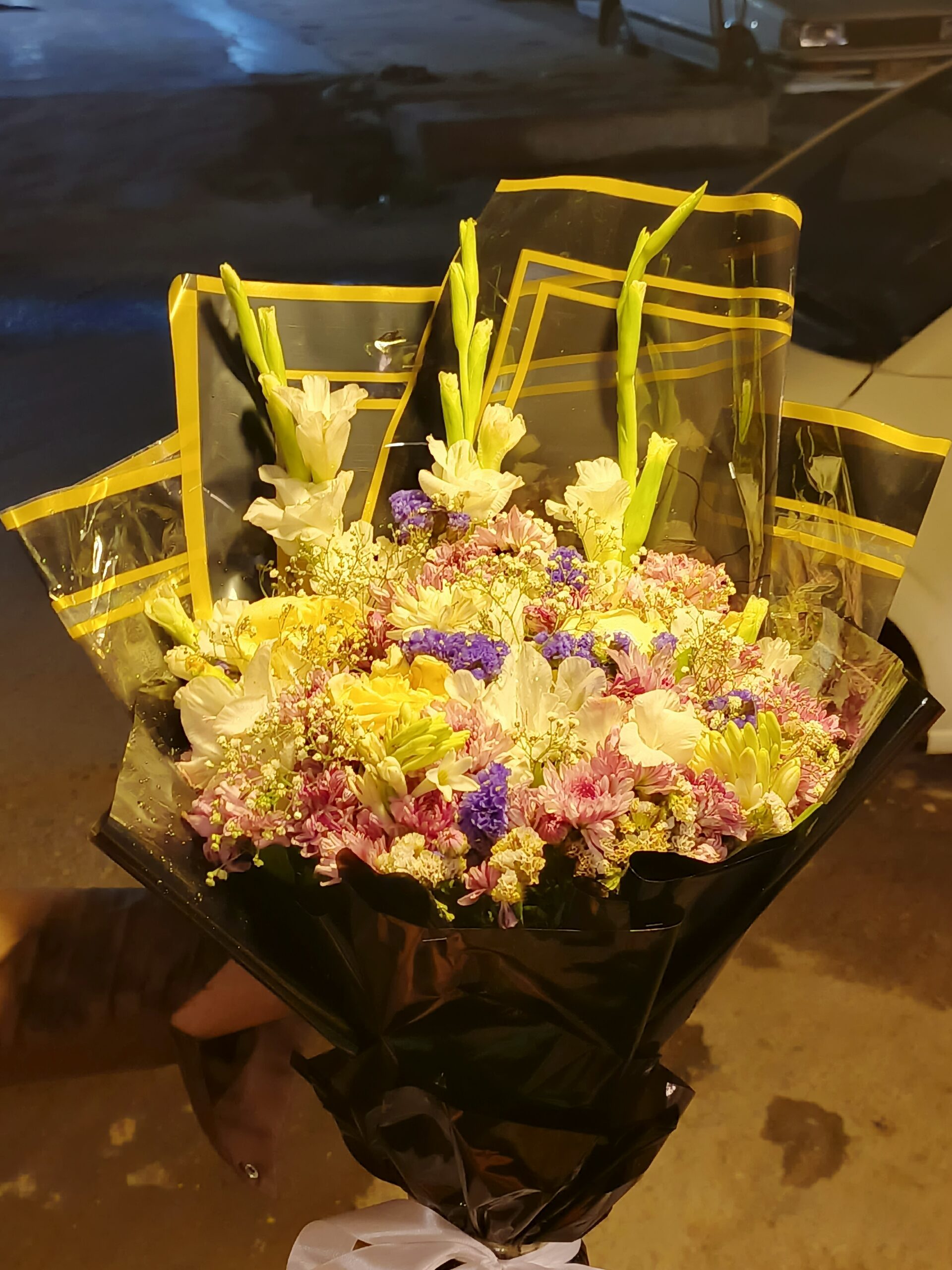 A luxurious mixed flower bouquet featuring gladiolus and statice, elegantly wrapped in black and gold paper for a bold, modern, and sophisticated floral gift.