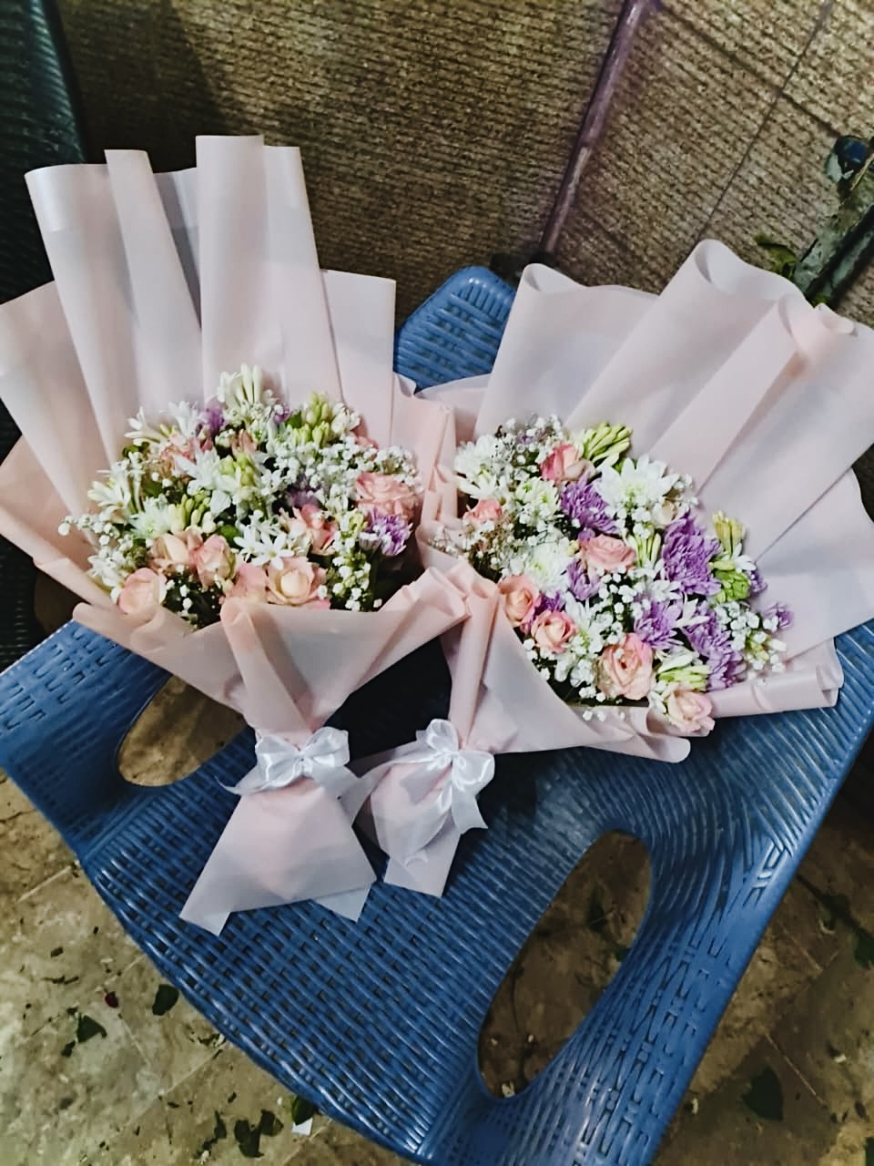 Delicate filler flowers such as baby’s breath or greenery are often added to enhance texture and fullness. The stems are gathered into a compact, hand-held bouquet, wrapped in decorative floral paper, mesh, or kraft paper, and tied with a ribbon for a polished finish.