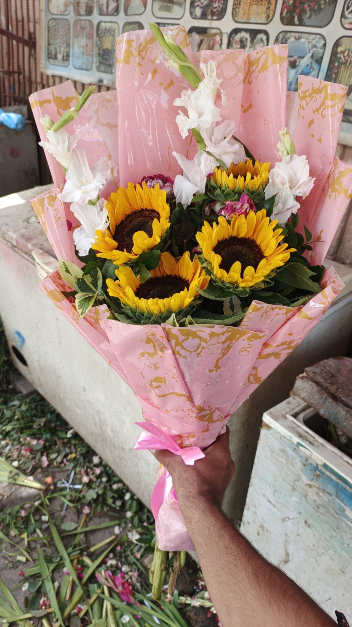 Add a touch of elegance, warmth, and color to any special moment with our Mixed Rose, Sunflower, and Gladiolus Bouquet in Pink Marble Wrap. This handcrafted floral arrangement combines the romantic charm of roses, the cheerful brightness of sunflowers, and the graceful height of gladiolus, creating a beautifully balanced and visually striking bouquet.
