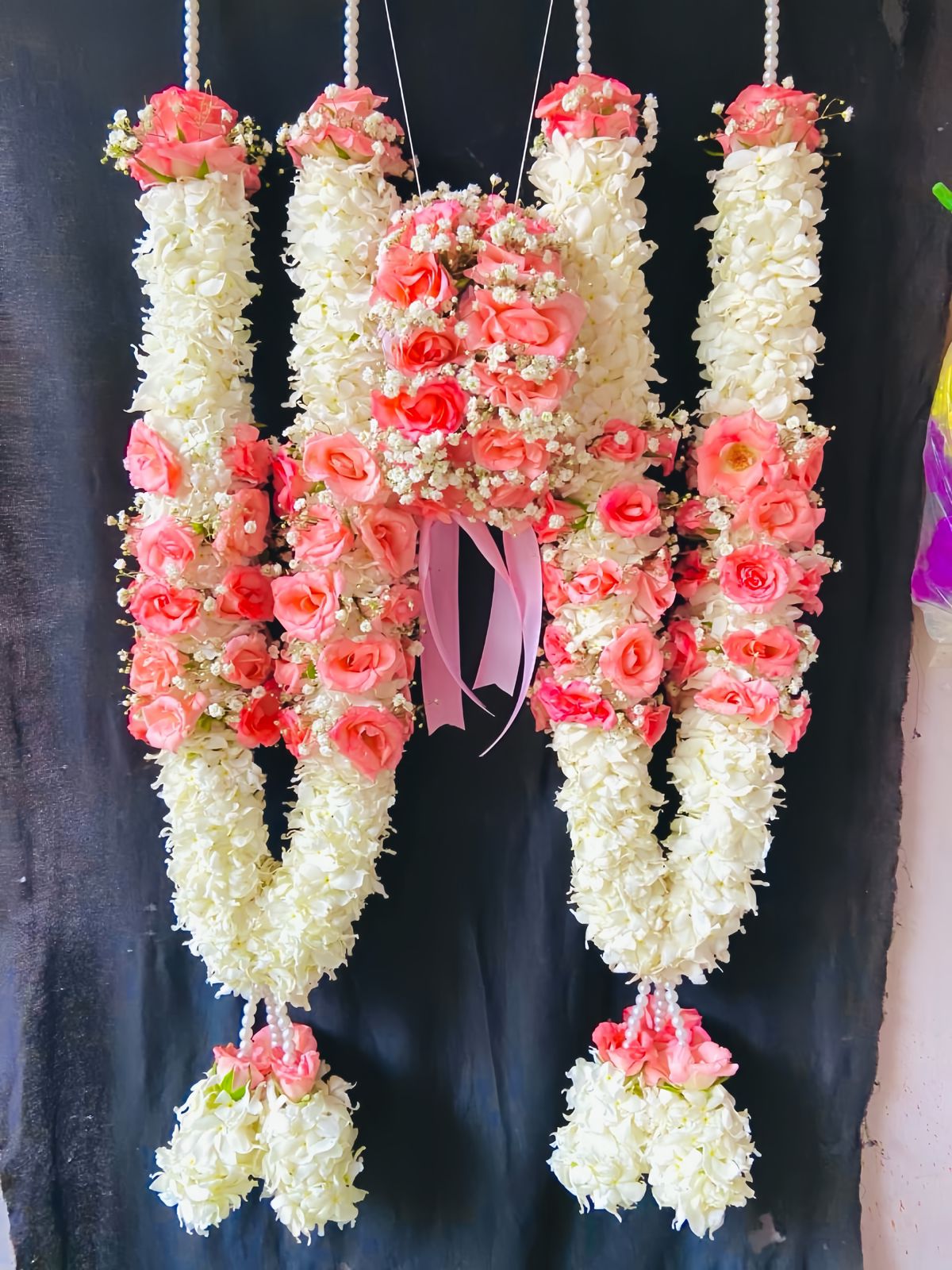 Complementing the pink flowers are white blooms, which provide balance and elegance. White flowers symbolize purity, peace, and new beginnings. Their neutral tone brightens the garland and enhances the softness of the pink petals. The combination of pink and white creates a visually soothing palette that feels fresh, timeless, and sophisticated.
