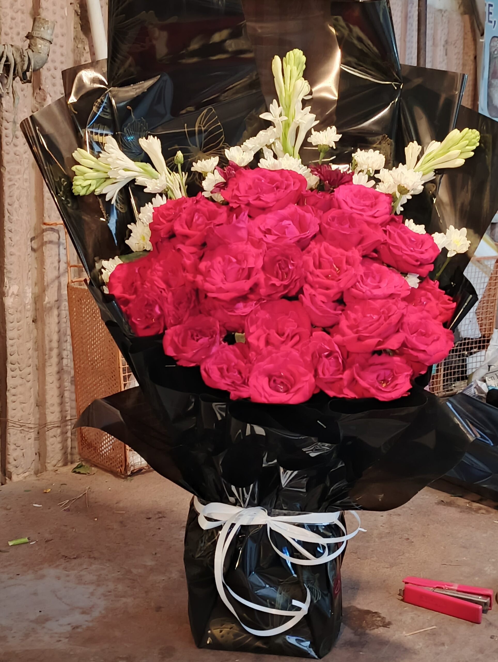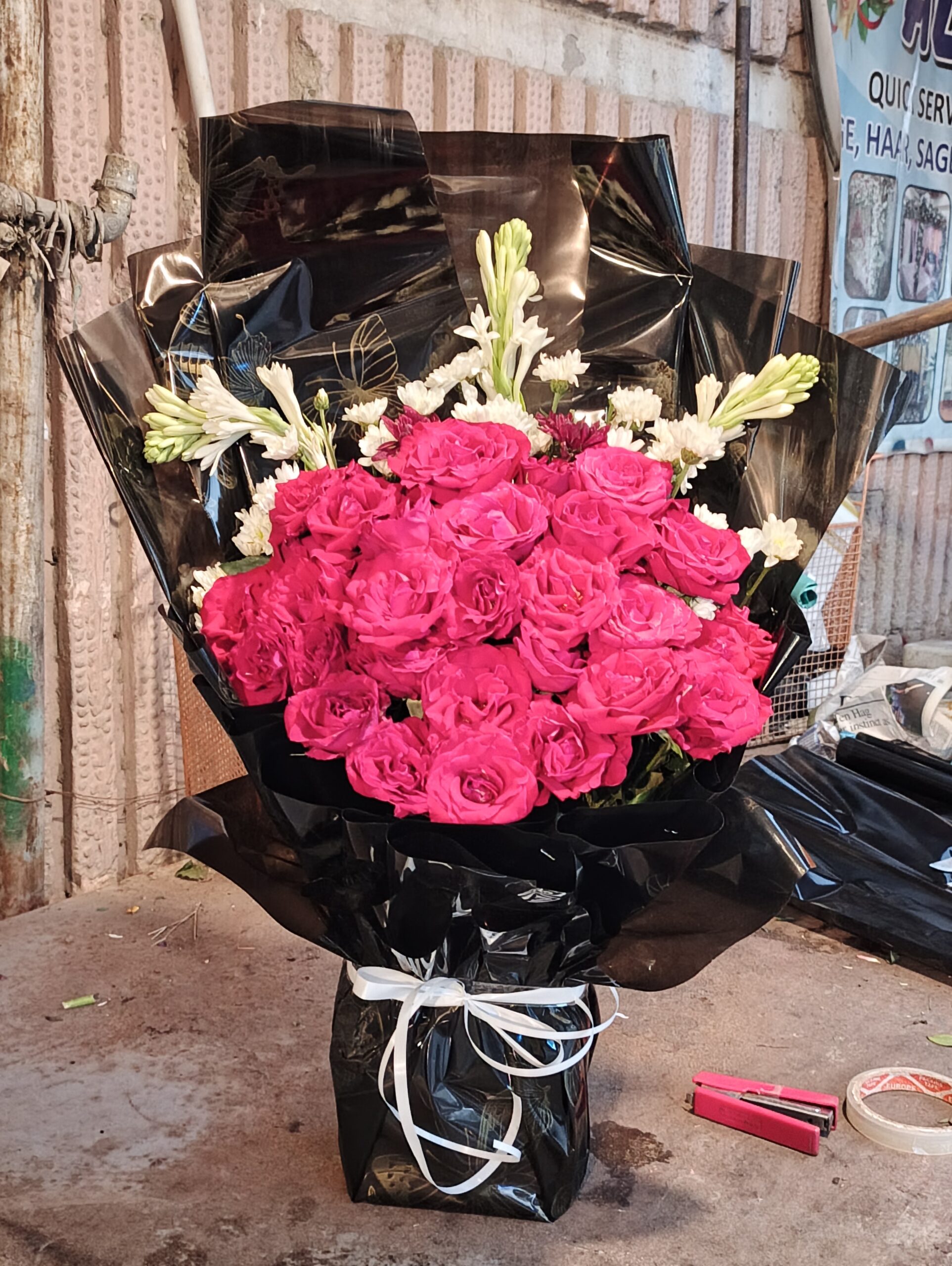 Experience refined elegance with our Pink Rose and Tuberose Flower Bouquet in Glossy Black Wrap, a stunning floral arrangement crafted to express romance, grace, and modern sophistication. Featuring fresh pink roses paired with fragrant tuberose, this bouquet delivers a delicate balance of softness and charm, elevated by sleek glossy black wrapping for a bold, premium finish.