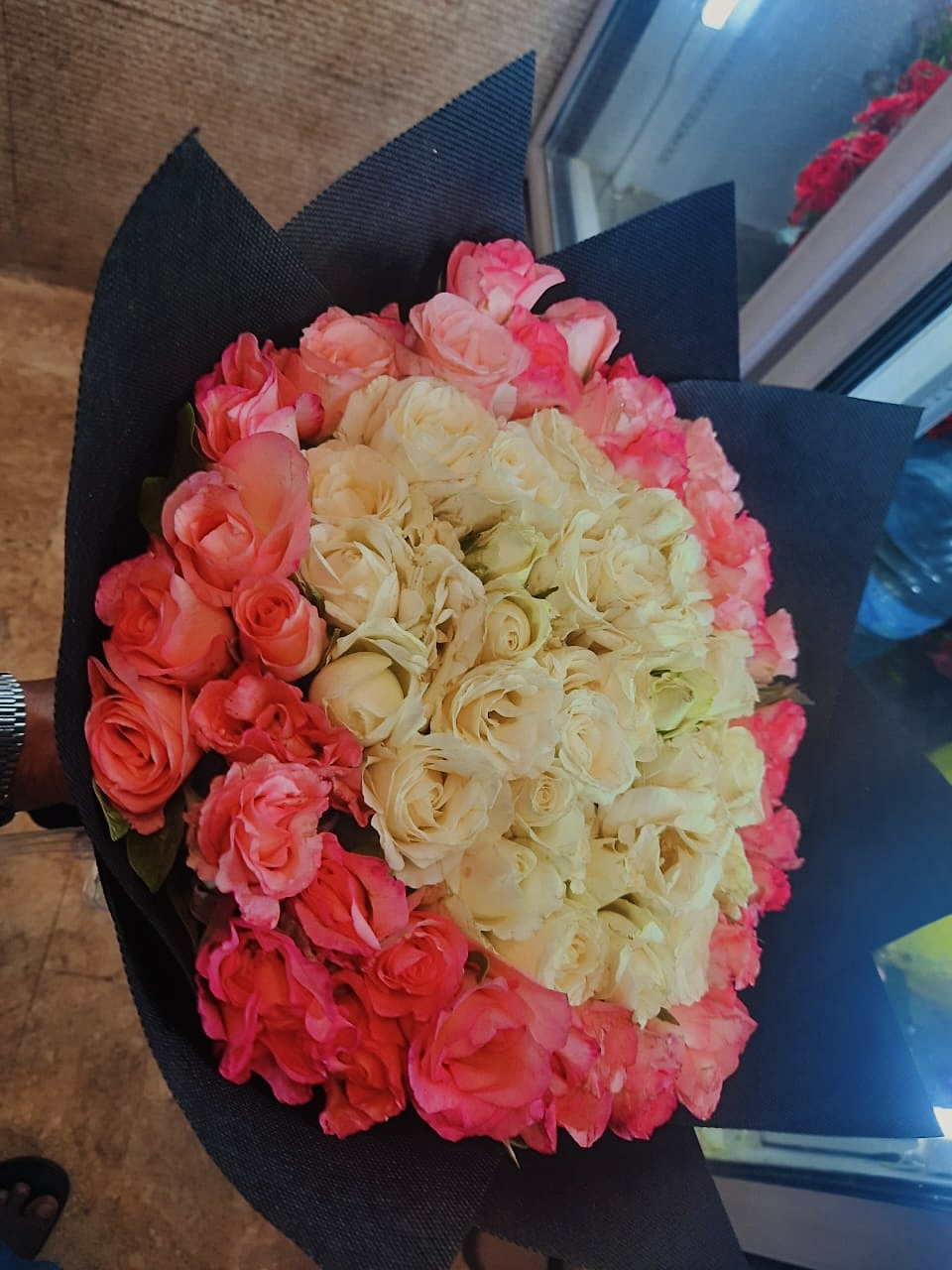 A pink and white roses bouquet in black wrap is a stunning combination of romance, elegance, and contemporary style. The soft hues of pink and white roses contrast beautifully against the sleek black wrapping, creating a bouquet that is both sophisticated and eye-catching.