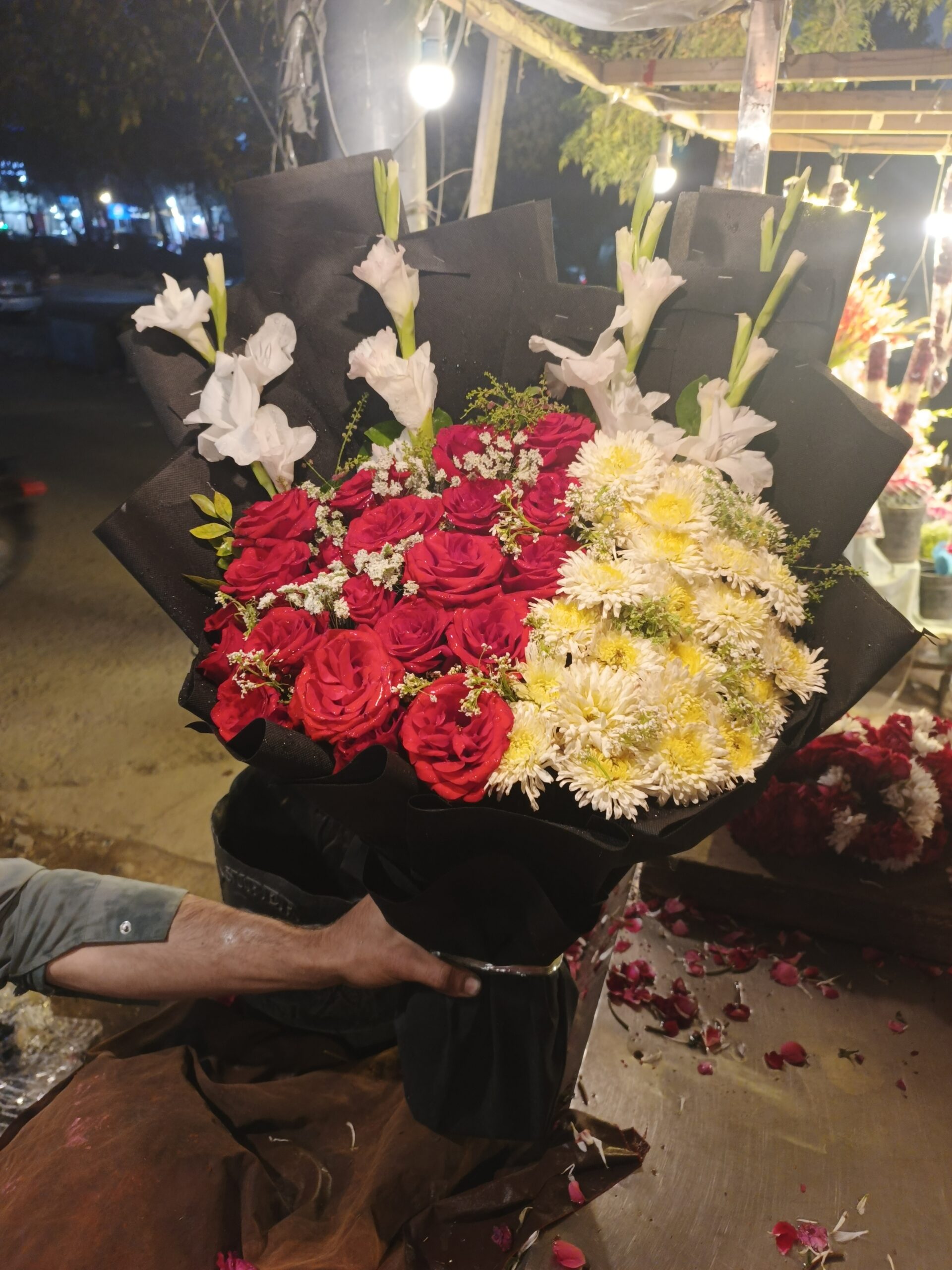 Express love, elegance, and heartfelt emotions with this Red Rose and White Chrysanthemum Bouquet with Gladiolus, thoughtfully handcrafted to create a stunning floral combination. The deep red roses symbolize love and passion, while the soft white chrysanthemums add purity and charm. Tall gladiolus stems complete the arrangement with a touch of sophistication.