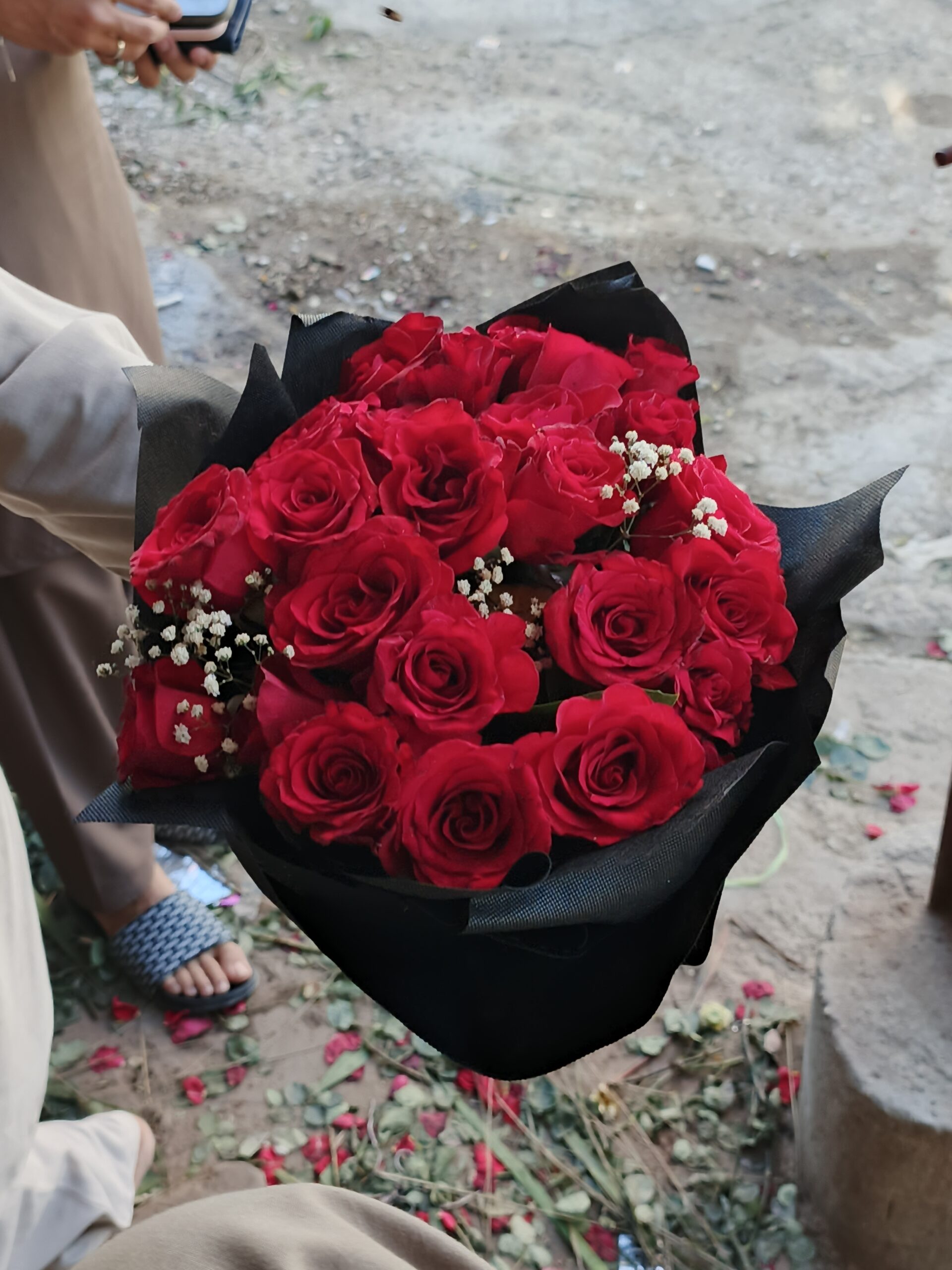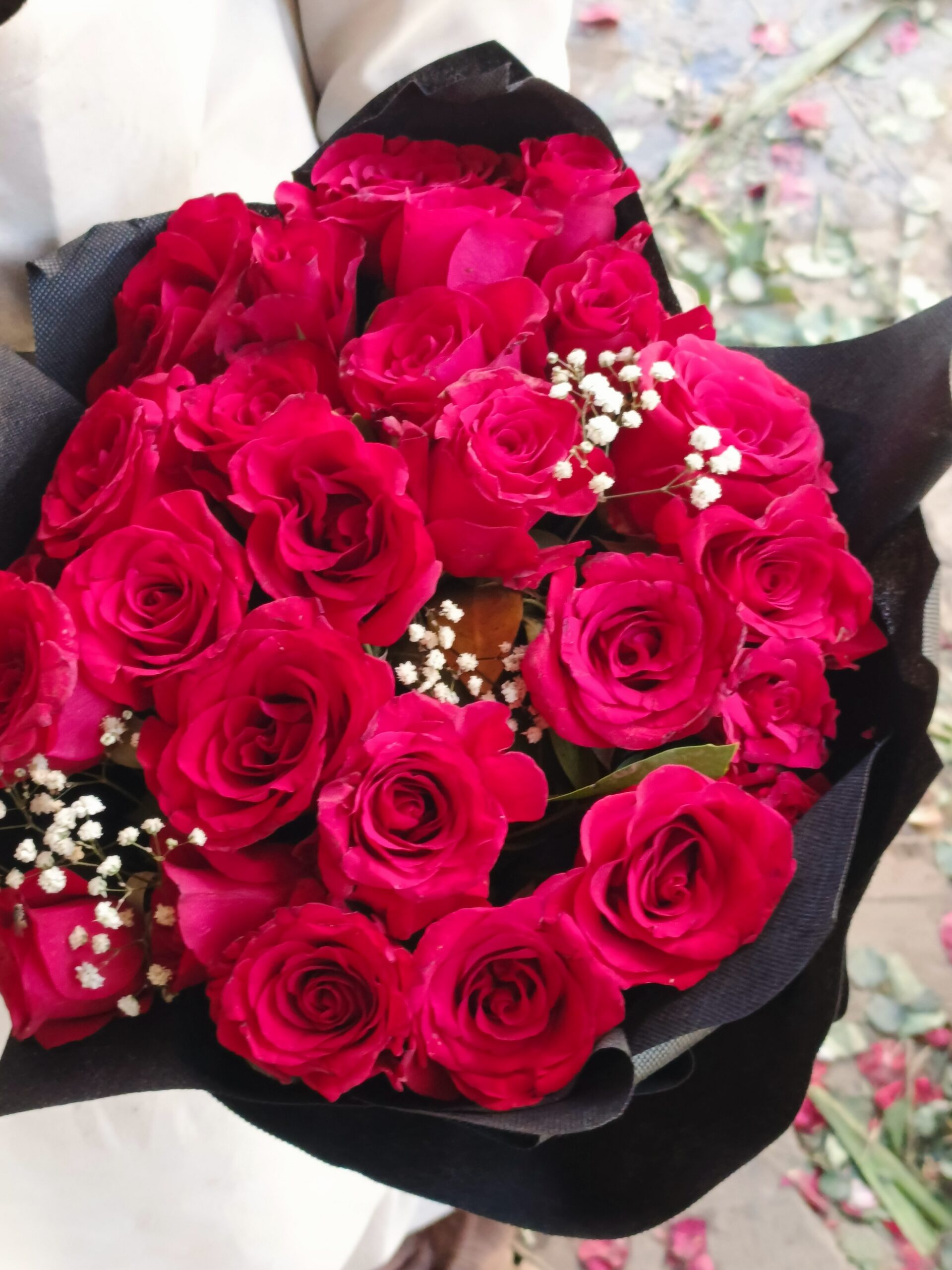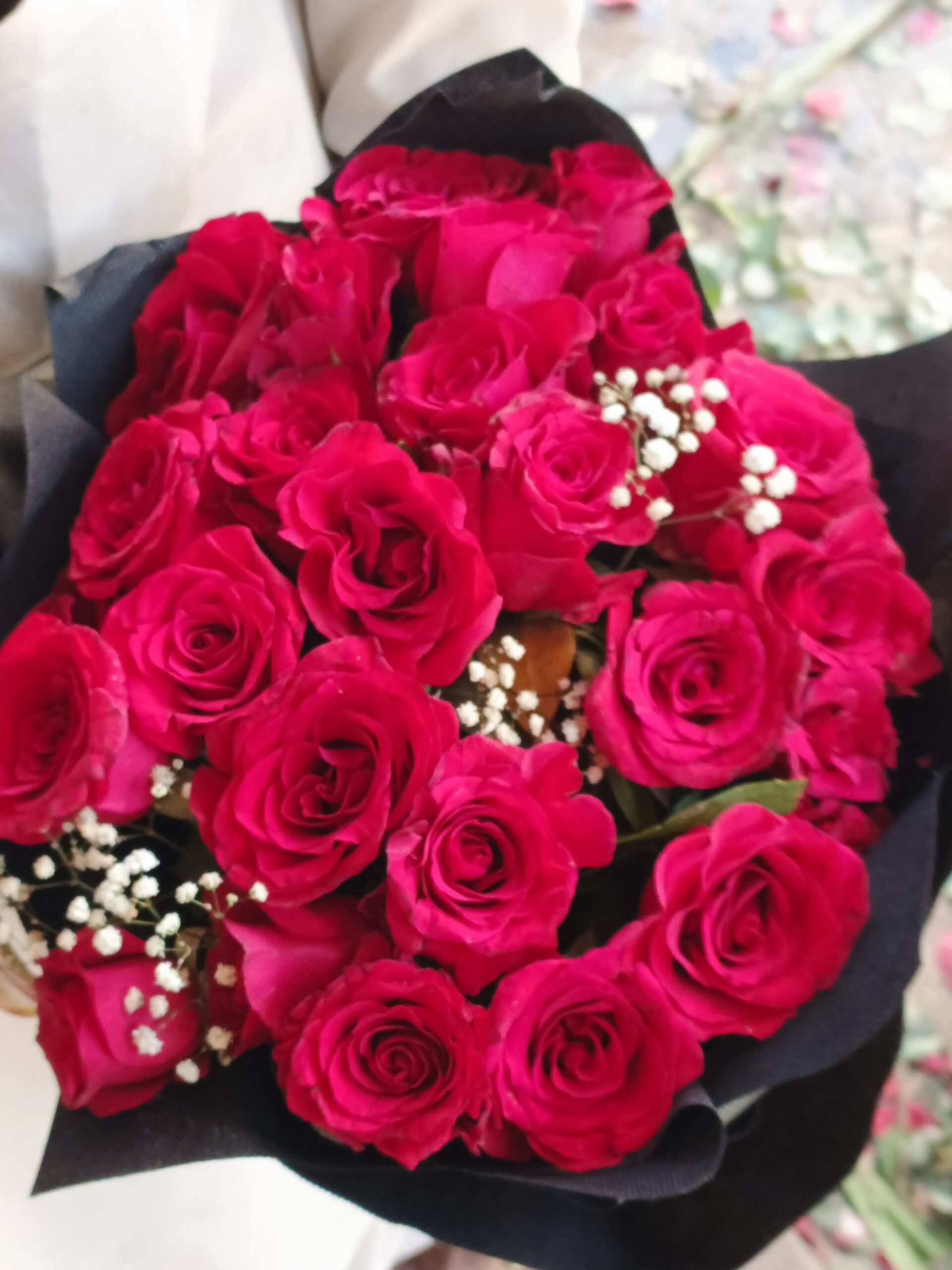 A classic yet striking bouquet of fresh red roses complemented with delicate white baby’s breath, elegantly wrapped in black paper for a bold and romantic statement.