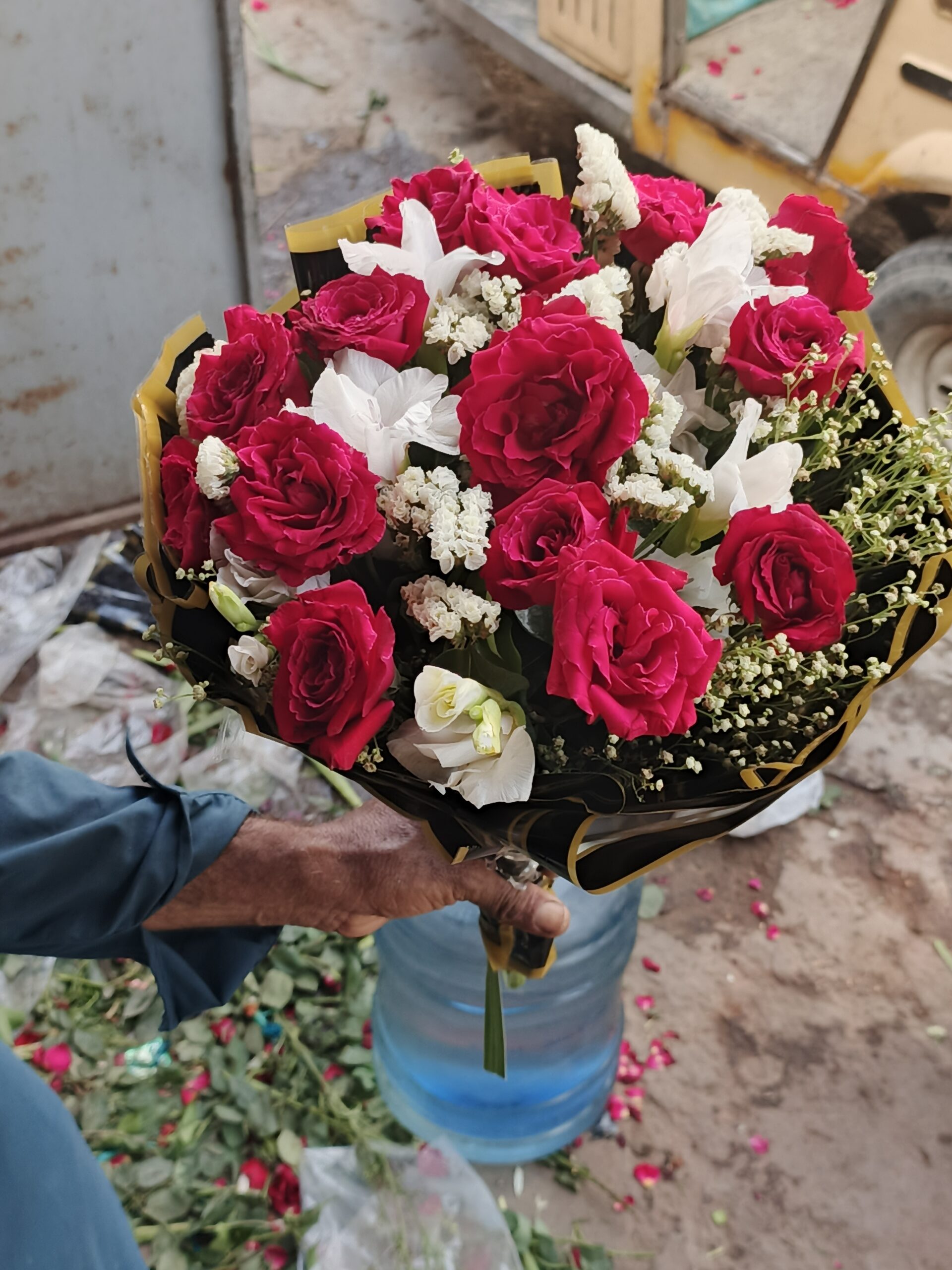 Make a lasting impression with our Red Rose, White Lily, and Statice Bouquet in Gold-Edged Black Wrap, handcrafted to blend romance, elegance, and luxury. The deep red roses symbolize love and passion, white lilies represent purity and grace, and statice adds texture and charm. Wrapped in premium black paper with gold-edged accents, this bouquet exudes a modern yet timeless elegance.