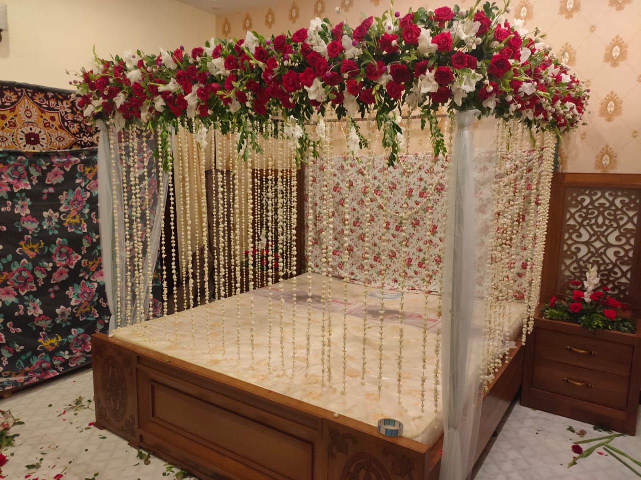 Our Royal Crimson Rose & Jasmine-Veil Bed Decor is designed for an unforgettable romantic transformation. The installation features a high-volume, 360-degree overhead frame densely packed with premium red roses, vibrant pink accents, and fresh emerald greenery.