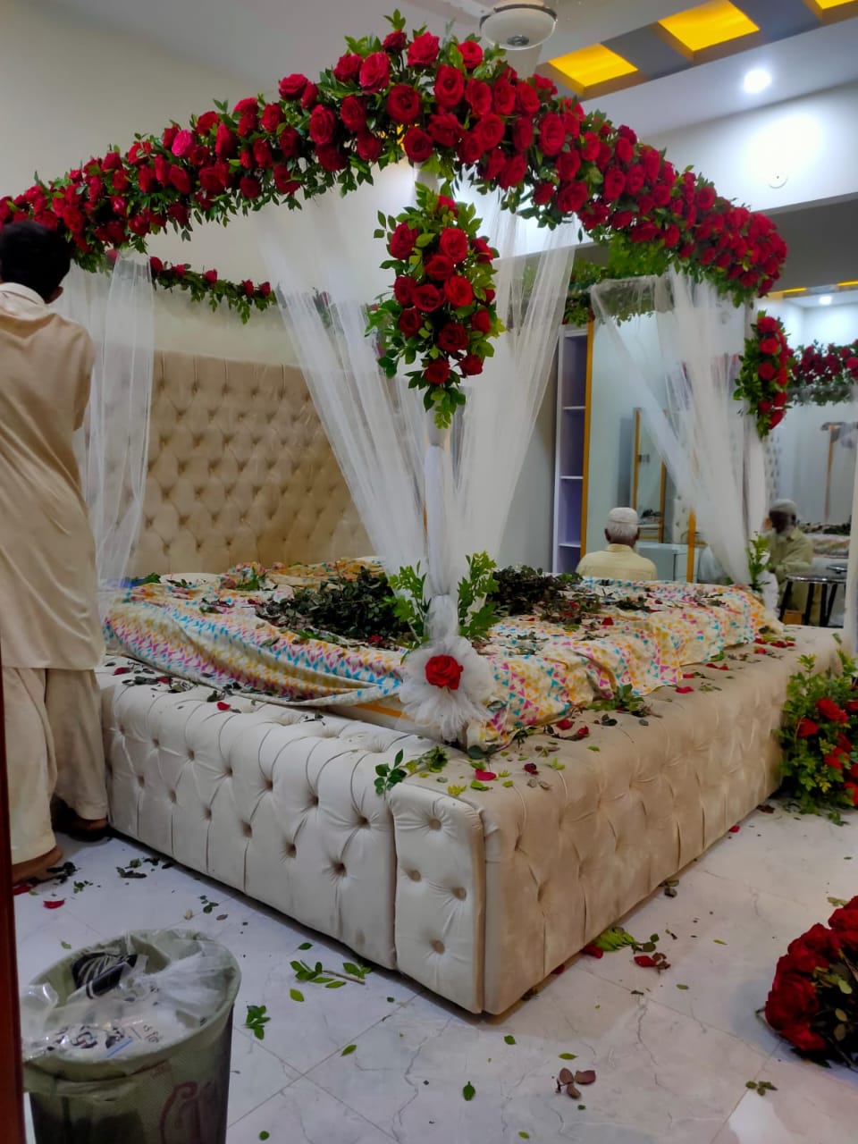 The structure is softened by high-quality sheer ivory chiffon drapes that flow from the ceiling to the floor, tied back at the pillars with vibrant floral bouquets. To enhance the romantic effect, the bed is adorned with freshly scattered rose petals, while vertical floral “drops” add a sense of height and luxury. This setup is specifically engineered to provide a sense of intimate seclusion while ensuring the room remains fragrant and visually breathtaking from every angle.
