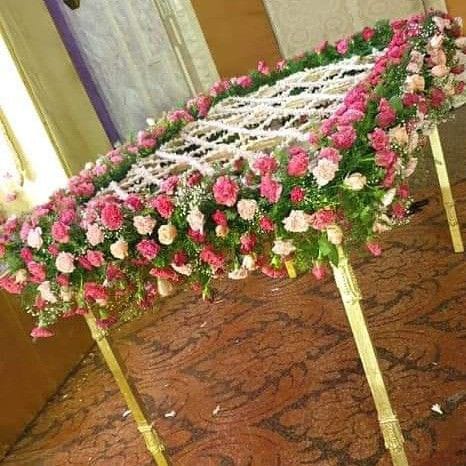 The structure is framed by a luxurious, high-density border of shaded pink and crimson roses, interspersed with lush green foliage and airy Baby’s Breath (Gypsophila). Supported by a sturdy, ornate frame, this Chadar is lightweight enough for brothers or cousins to carry comfortably while providing a stunning, fragrant floral frame for photography.
