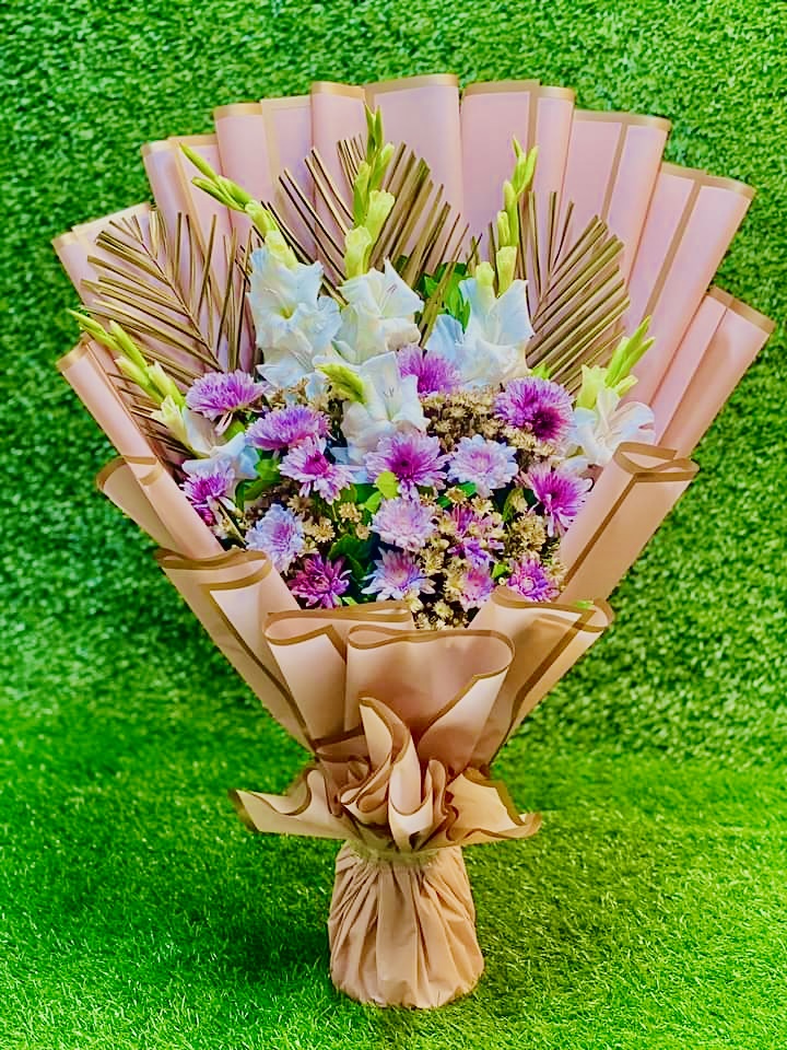 Make a statement of elegance and charm with this White Gladiolus & Light Purple Chrysanthemum Bouquet. Featuring striking white gladiolus flowers symbolizing strength, integrity, and remembrance, paired with soft light purple chrysanthemums representing grace, admiration, and refinement, this bouquet exudes sophistication and thoughtful beauty.