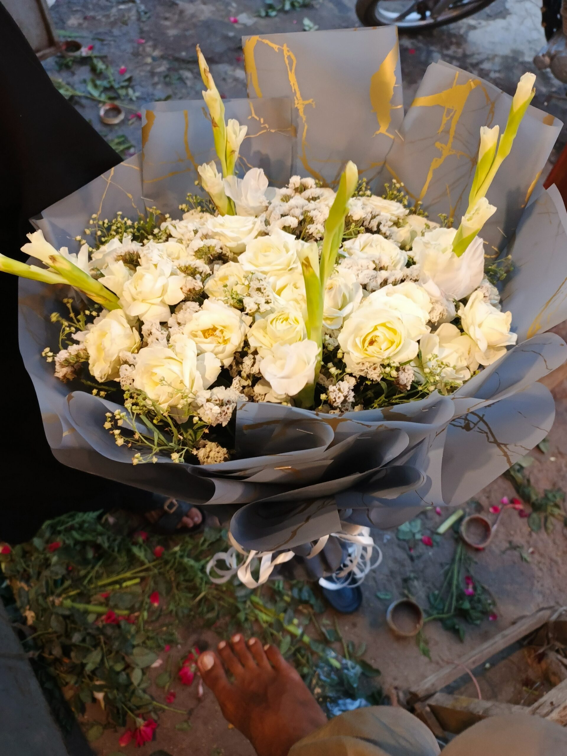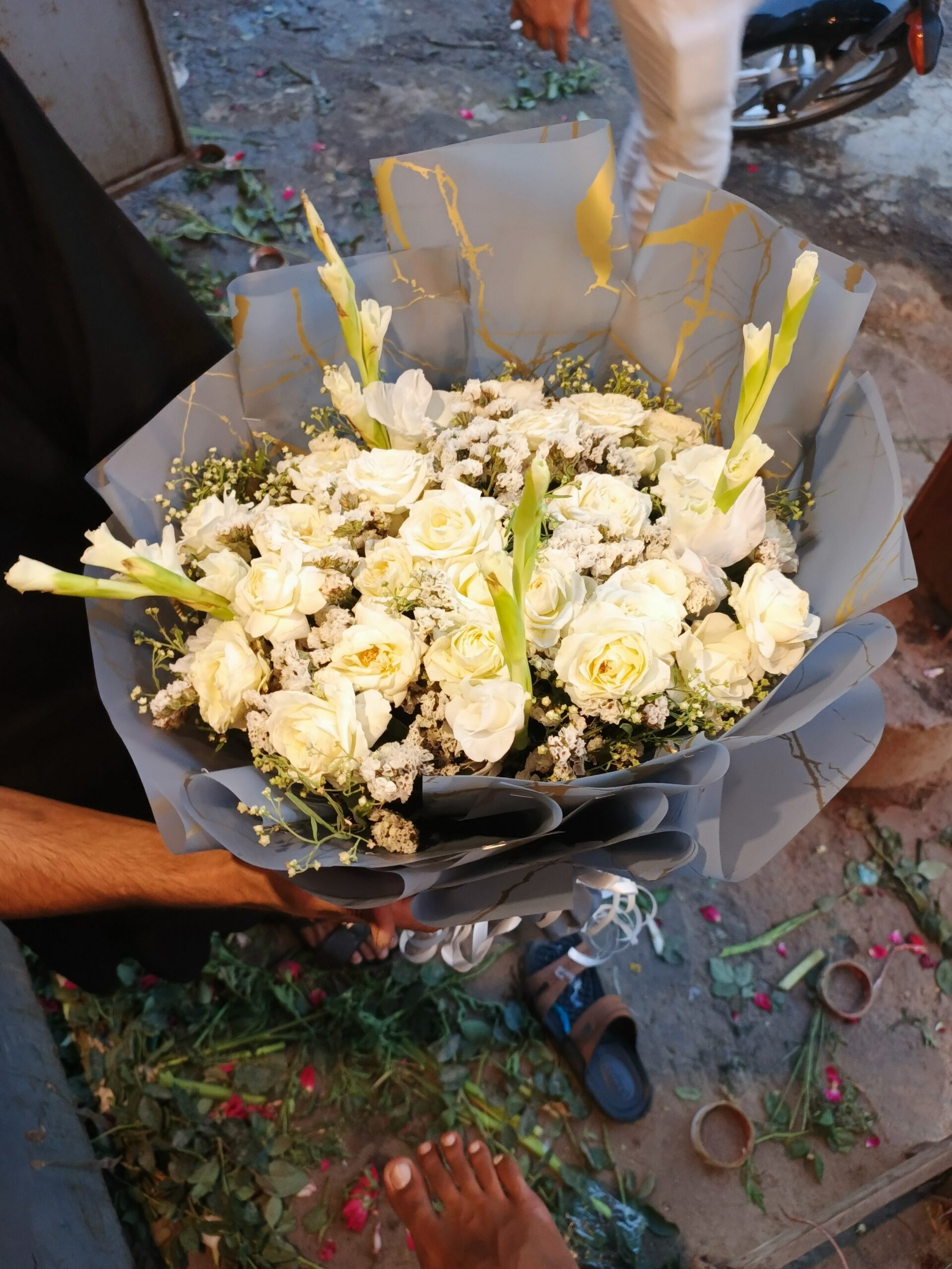 The elegant pairing of white roses and gladiolus conveys a thoughtful message of love, admiration, and grace, while the luxurious gold-veined wrap elevates the presentation to a premium level. Whether displayed in a vase at home, presented at a formal event, or gifted to someone special, this bouquet delivers sophistication, emotion, and timeless beauty.